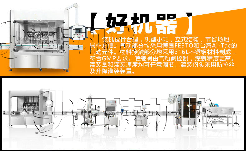 全自動辣椒醬六頭灌裝機(jī)作為公司新研發(fā)的灌裝設(shè)備在市場上起到了關(guān)鍵性的作用,是集光,機(jī),電,氣于一體,采用活塞式定量原理,灌裝精度高,操作簡單,維護(hù)方便,設(shè)備主要材質(zhì):采用SUS304不銹鋼制造,符合衛(wèi)生要求.灌裝過程采用亞克力透明板與外界隔離,保證灌裝的衛(wèi)生要求。灌裝采用壓力式灌裝,無需配裝高位罐,簡化了安裝工序,提高了灌裝效率??蓮V泛應(yīng)用于食品、醬料行業(yè)產(chǎn)品的自動化包裝生產(chǎn)。