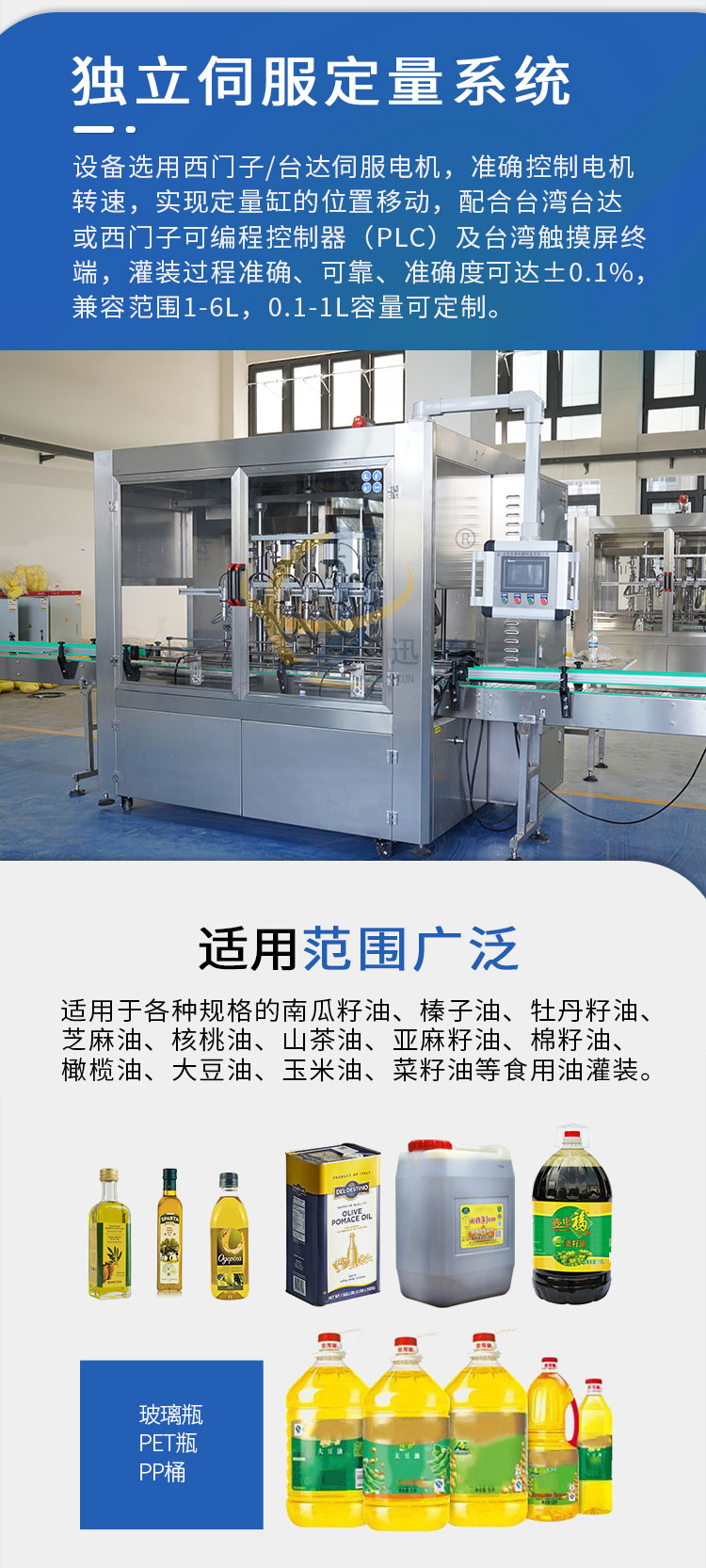 流量計(jì)食用油灌裝機(jī)適用于亞麻籽油、菜籽油、大豆油、芝麻油、橄欖油、花生油、玉米油、山茶油等食用油灌裝。