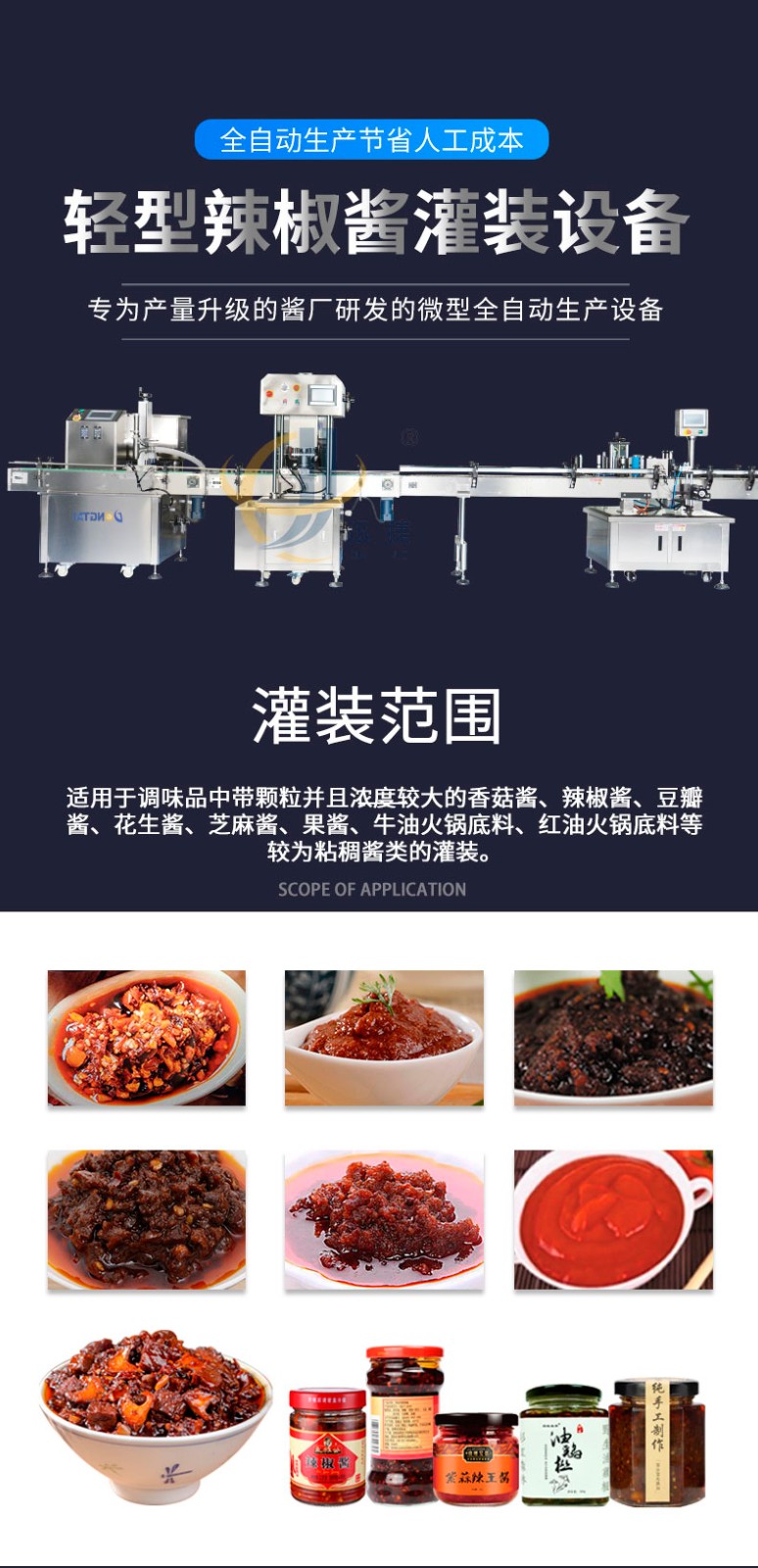 輕型辣椒醬灌裝生產線適用于調味品中帶顆粒并且濃度較大的香菇醬、辣椒醬、豆瓣醬、花生醬、芝麻醬、果醬、牛油火鍋底料、紅油火鍋底料等較為粘稠醬類的灌裝。