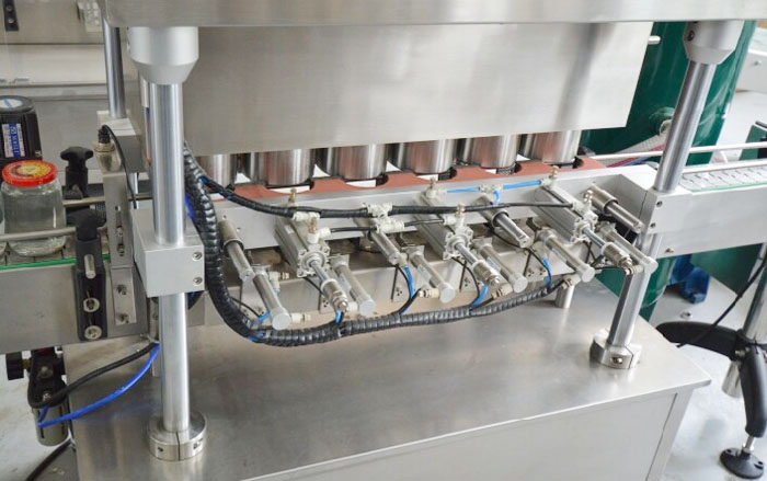 罐頭真空封蓋機(jī)用于調(diào)味品醬、水產(chǎn)罐頭、水果罐頭等采用目前環(huán)保的玻璃瓶包裝后對(duì)瓶?jī)?nèi)真空度有比較高要求的三旋、四旋蓋的玻璃瓶進(jìn)行封蓋,本機(jī)配上真空系統(tǒng)后,能先對(duì)玻璃瓶?jī)?nèi)進(jìn)行抽吸真空,然后再進(jìn)行旋蓋封口,以延長(zhǎng)瓶?jī)?nèi)容物的保質(zhì)期及增強(qiáng)口感,而且不用加熱以保持物料色澤不變。實(shí)行自動(dòng)進(jìn)瓶、自動(dòng)封蓋、自動(dòng)進(jìn)行抽真空。