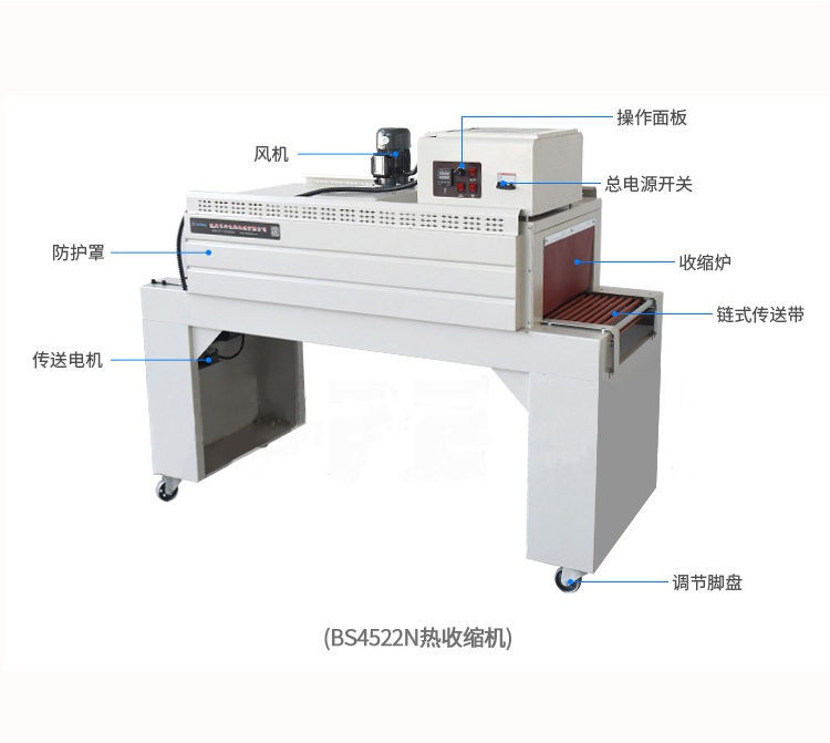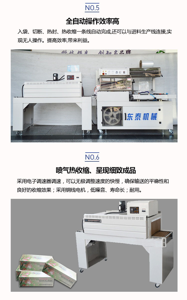 自動塑料膜熱收縮包裝機(jī)結(jié)構(gòu)緊湊占地面積小,非常適合配套自動包裝流水線完成產(chǎn)品的自動無人化包裝,適合于單個物品包裝或有底托物品包裝。自動送膜打孔裝置和手動調(diào)節(jié)的導(dǎo)膜系統(tǒng)以及手動調(diào)節(jié)的進(jìn)料輸送平臺,可適于不同寬度和高度的產(chǎn)品,實現(xiàn)一臺機(jī)器滿足各種尺寸的包裝物品。