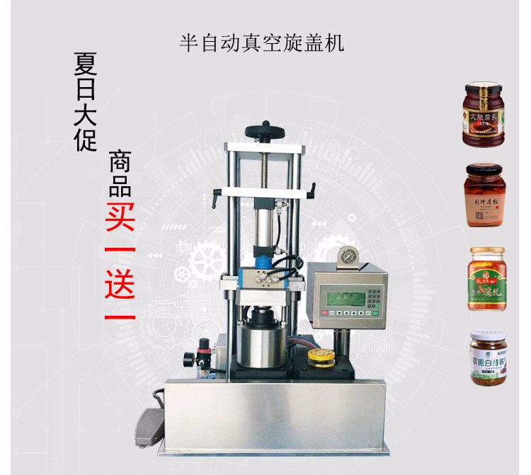 這款小型辣椒醬封口機(jī)主要用于食品包裝,采用標(biāo)準(zhǔn)馬口鐵爪式旋開蓋封口的玻璃瓶包裝??蓪?shí)現(xiàn)的功能是抽吸包裝容器內(nèi)的空氣使其達(dá)到設(shè)定的負(fù)壓值(即抽真空),然后旋緊蓋子。 為半自動(dòng)機(jī)型,即人工進(jìn)出瓶,人工配蓋,其他過(guò)程自動(dòng)。
